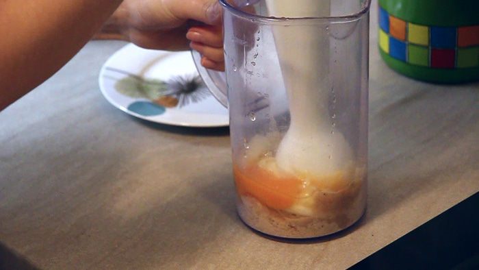 Измельчаем с помощью блендера орехи, 3-4 щепотки панировочных сухарей, лук, твердый сыр и яйцо (яйцо можно добавить непосредственно в фарш — по вашему желанию). Все хорошо перемешиваем.