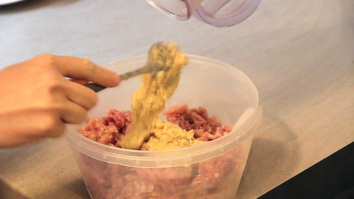 Добавляем получившуюся смесь в фарш. Солим и перчим. Все хорошо перемешиваем.
