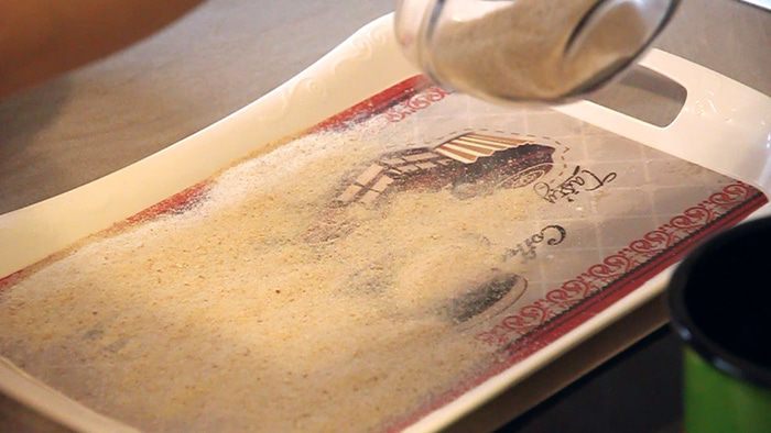 Тем временем подготавливаем разнос и посыпаем его панировочными сухарями. Так будет быстрее и удобнее обваливать в панировке маленькие котлетки.