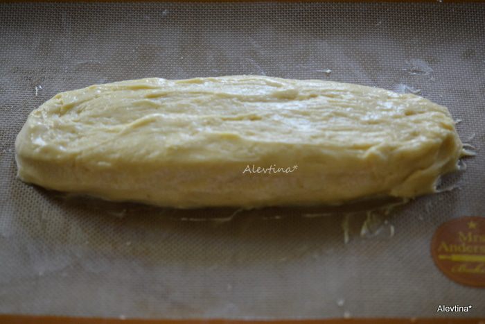 Тесто выложить в виде батона на противень смазанный с бумагой для выпечки.