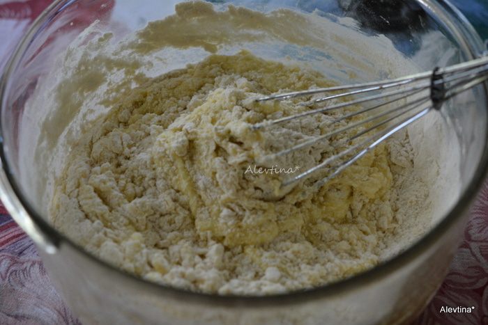 Добавить муку и перемешать. Тесто будет прилипчивым.