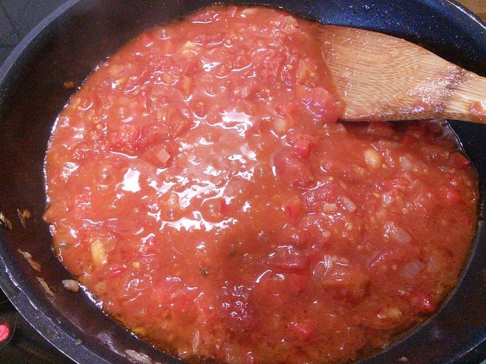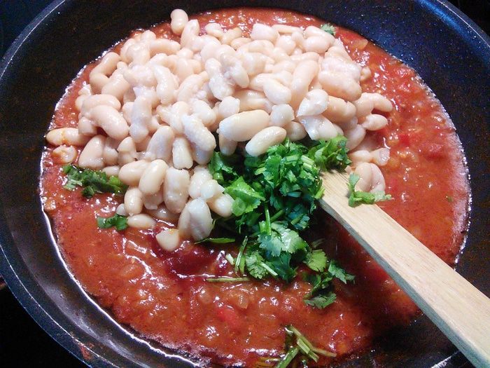 Солим, перчим и добавляем сахар по вкусу. Промываем фасоль под проточной водой и добавляем фасоль к томатном соусу. Прогреваем и добавляем петрушку.