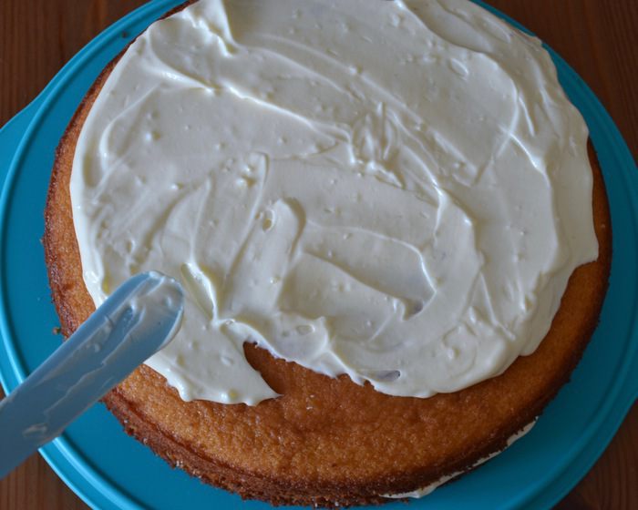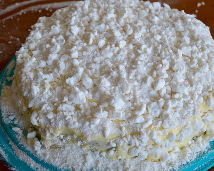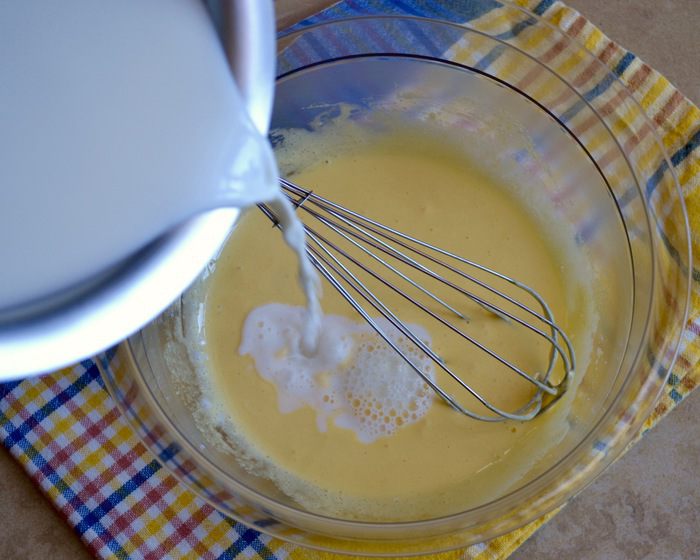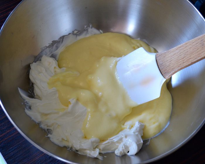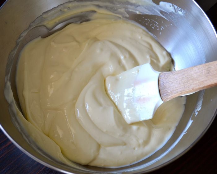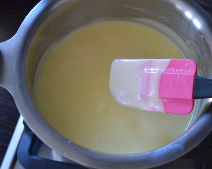 Перелить весь крем в кастрюльку с оставшимся молоком и варить на среднем огне до готовности, постоянно помешивая! Крем не должен закипеть, так как это не заварной крем в чистом виде... Фактически, он должен достигнуть температуры около 82°C. Если у вас нет кулинарного термометра, то просто ориентируйтесь по состоянию самого крема — он должен загустеть настолько, чтобы на силиконовой лопатке (ложке) оставался слой крема (как на фото). Сразу снять крем с огня и полностью остудить.