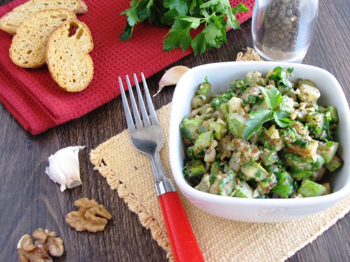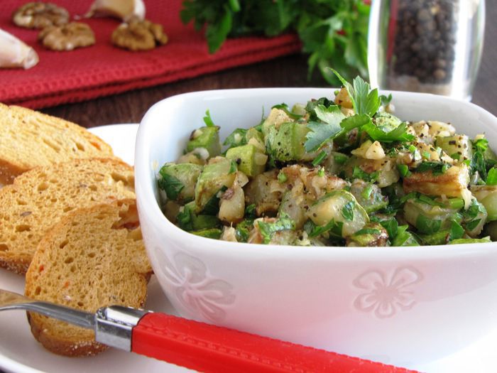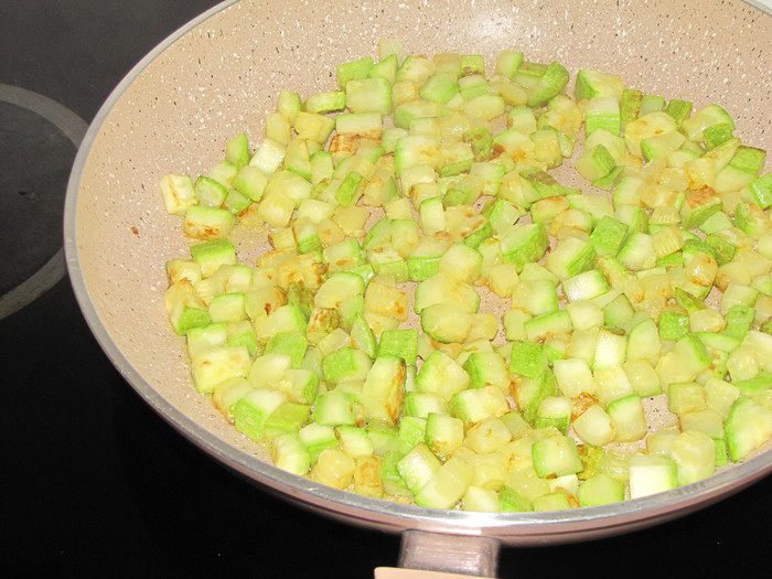 Молодые цукини или кабачки, вымыть и нарезать средним кубиком. Разогреть в большой сковороде оливковое масло и обжарить кубики цукини до золотистого цвета. Цукини должны лежать в один слой. Если сковорода небольшая, то цукини можно пожарить в два приема.