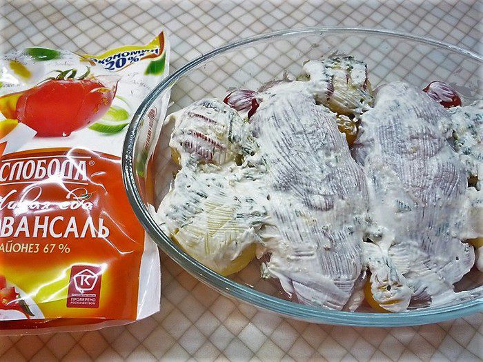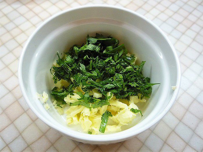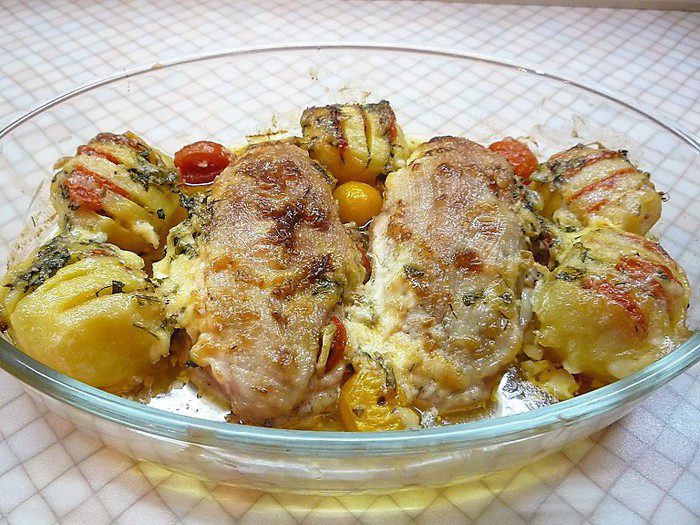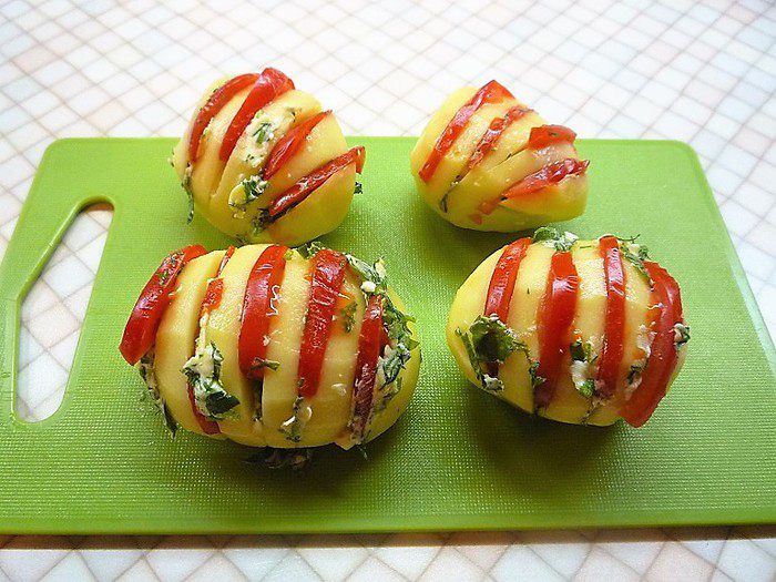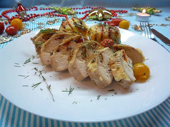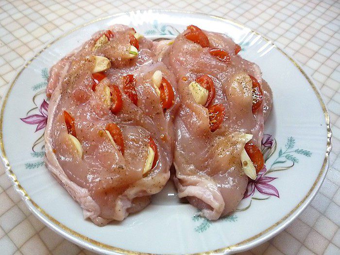 Куриные грудки промываем, просушиваем бумажным полотенцем, натираем солью и смесью специй. Помидоры моем и нарезаем небольшими пластинками. Чеснок очищаем и нарезаем дольками. На каждой грудке приподнимаем кожицу. Делаем несколько поперечных разрезов и шпигуем чесноком с помидорами.