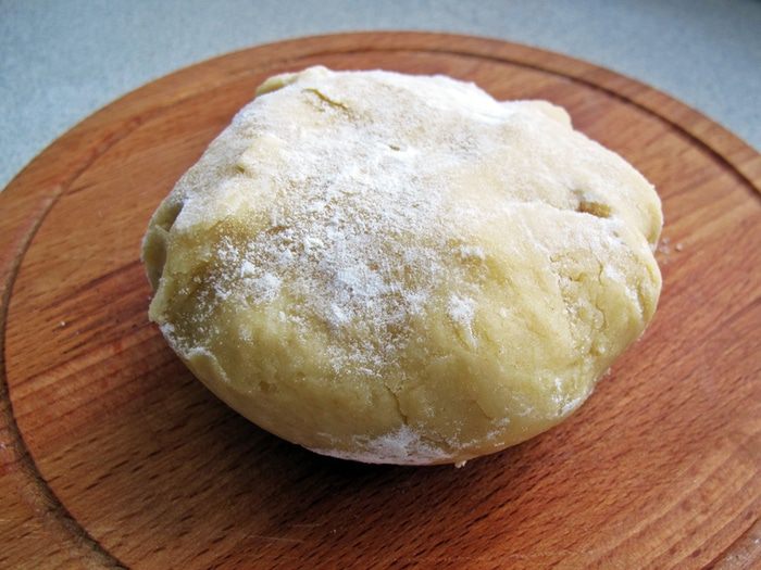 Муку смешать с разрыхлителем, 1/3 стакана сахара и солью. Добавить яйцо, мягкое масло, ряженку и замесить крутое тесто.