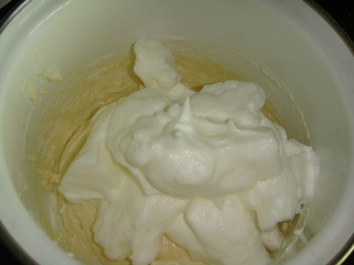 Выложить 2 ст. л. взбитых белков и аккуратно перемешать с мучной массой. Затем вмешать остальные белки.