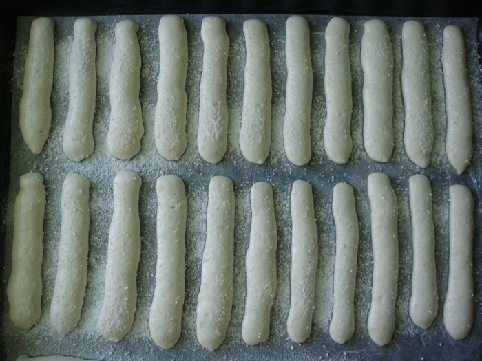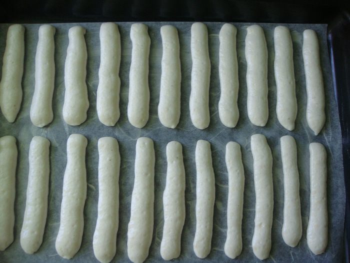 Противень застелить пекарской бумагой и смазать сливочным маслом. Тесто выложить в кондитерский мешок без насадки и отсадить полоски длиной 10 см. Делайте промежутки между печеньем побольше, а то у меня они в процессе выпекания немного слиплись.