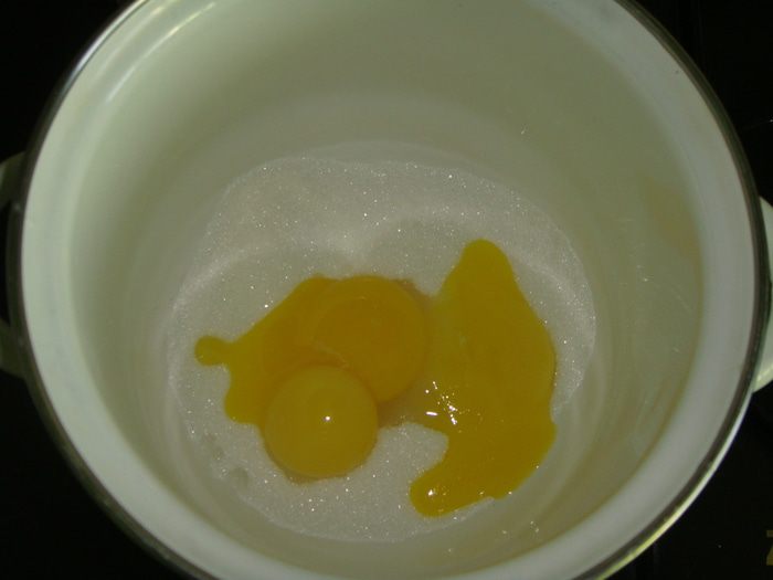 Желтки отделить от белков. Взбить желтки с 1/2 сахара добела.
