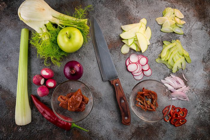 Тонко нарезать сельдерей, фенхель, лук, редис, вяленные томаты. Яблоко прямо с кожурой нарезать дольками самыми тонкими и сбрызнуть лимонным соком.