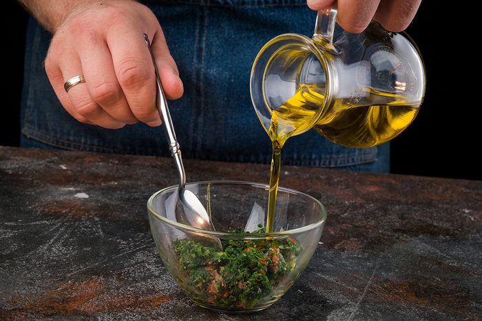 Для заправки заранее разморозить кубик шпината. Влить масло, добавить томаты, соль, перец.