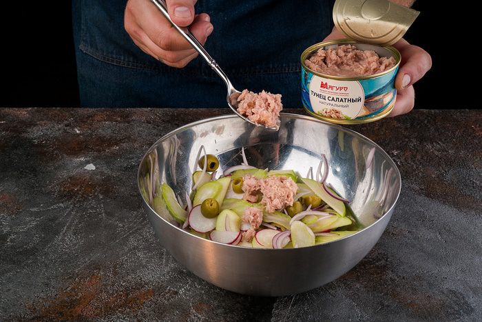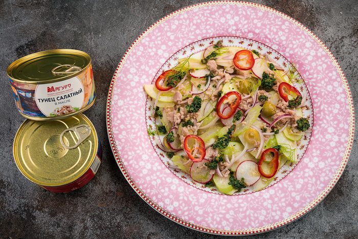 Выложить овощи на тарелку, сверху выложить тунец.