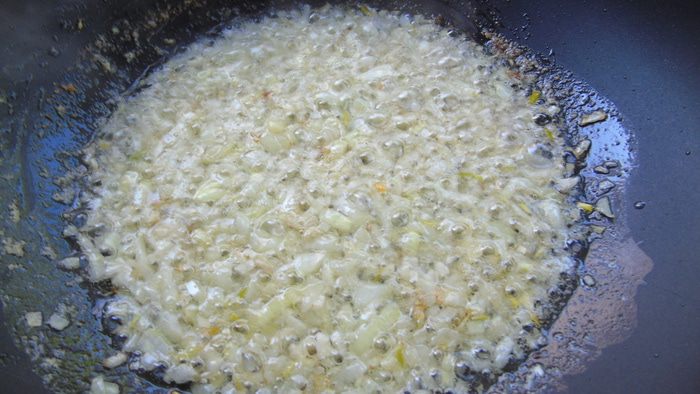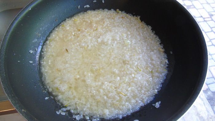 Всыпаем рис и поддержим его немного на огне чтобы «постекленел». Затем вливаем вино и даем ему выпариться, но рис успеет впитать все ароматы и вкус вина...