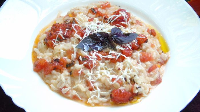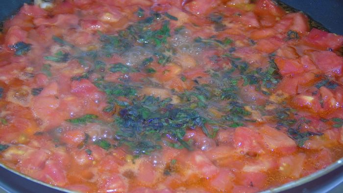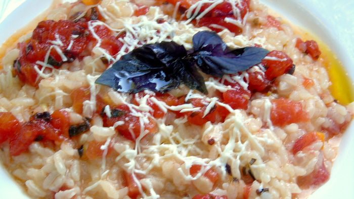 За 5 минут до готовности ризотто ставим еще одну сковороду на которой обжариваем 2-3 зубчика чеснока с мелко нарезанными стебельками базилика. Затем добавляем нарезанный кубиками помидор, солим, присыпаем сахаром (зависит от кислотности помидор) и добавляем нарезанные листики базилика.