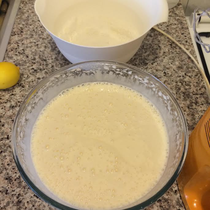 В другой миске взбить в пышную массу сахар, ванильный сахар и яйца. Добавить кефир, растительное масло и еще раз взбить.