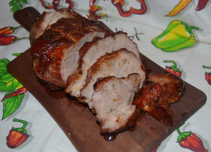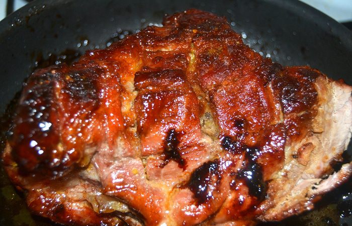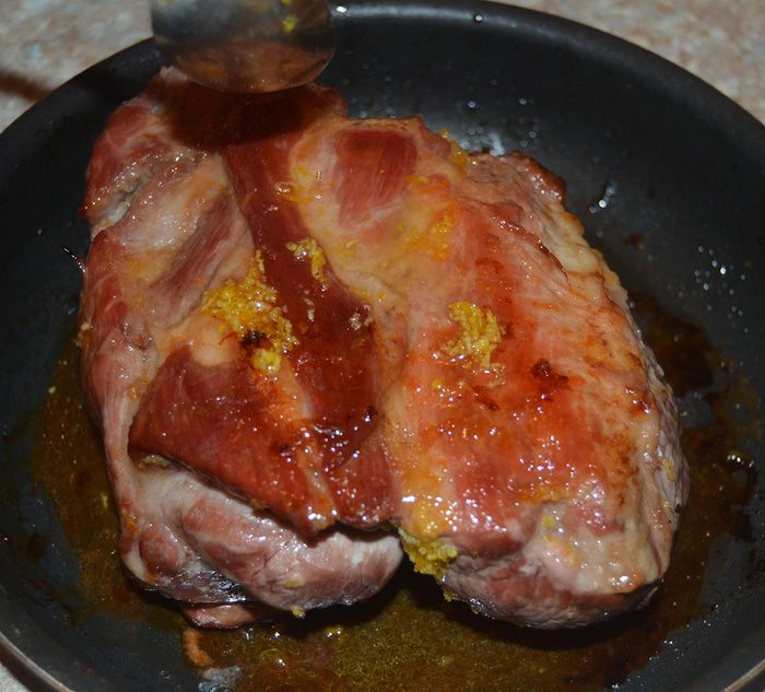 С апельсина снять цедру, из остального выжать сок. Мед растворить в воде, если он густой, прогреть на водяной бане до растворения. Добавить в медовую воду цедру и апельсиновый сок, любимые травы. Смазать этой водой мясо со всех сторон, выложить его в сковороду или форму и отправить в холодильник на целый день (10 часов). Удобно сделать это в той же посуде, в которой потом будете запекать мясо, чтобы не перекладывать его и не терять вкусный маринад. Время от времени кусок мяса нужно переворачивать, чтобы маринад равномерно пропитал его.