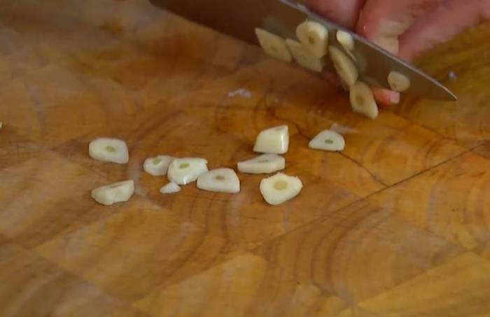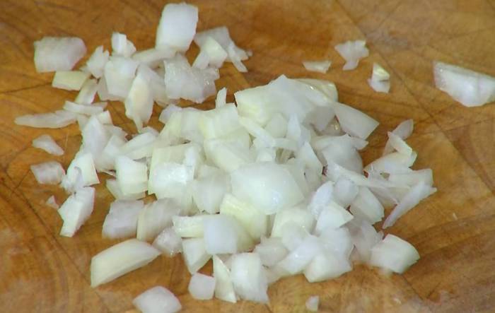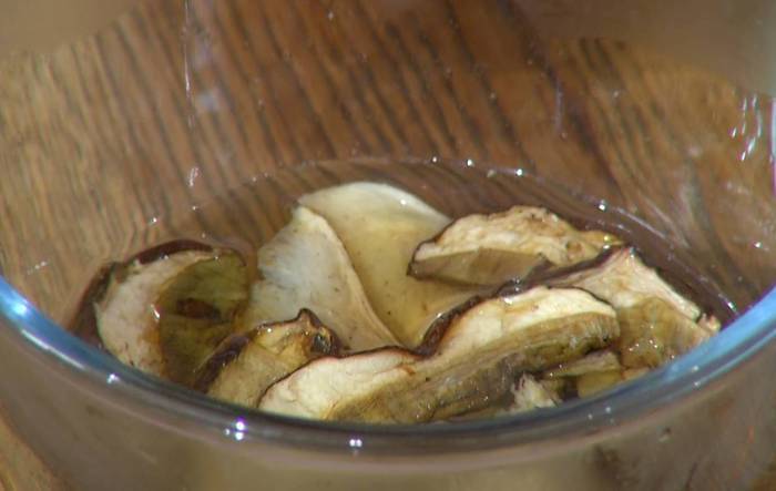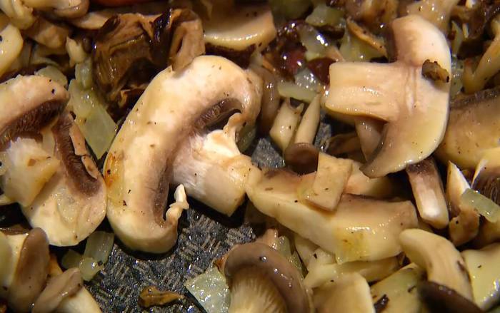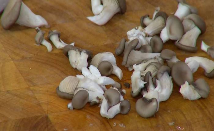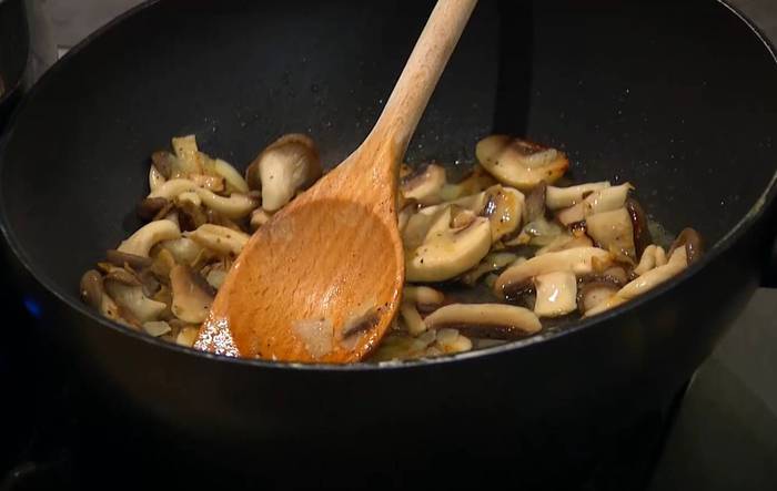 Воду, в которой замачивались лесные грибы, слить и сохранить, грибы мелко порезать, добавить в сковороду и обжаривать пару минут.