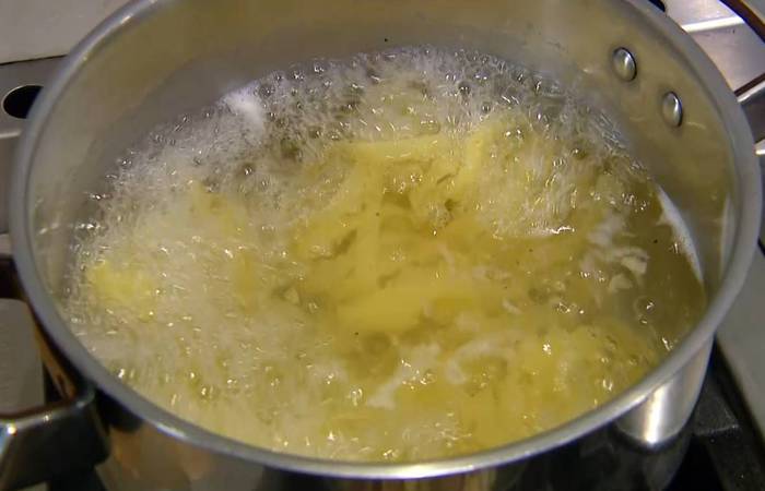 Фестонате отваривать в подсоленной воде на пару минут меньше, чем указано на упаковке, затем воду слить и сохранить.