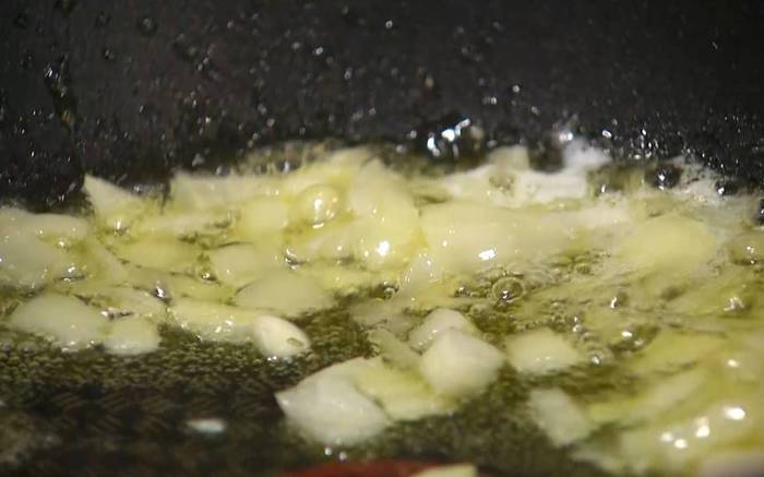 Разогреть в сковороде оливковое и сливочное масло и обжарить лук и чеснок.