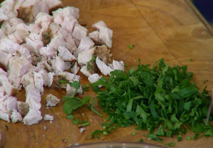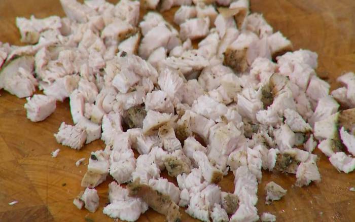 Филе индейки посыпать травами, скрепить пищевой нитью, завернуть в фольгу и запечь в разогретой духовке, затем нарезать небольшими кусочками.