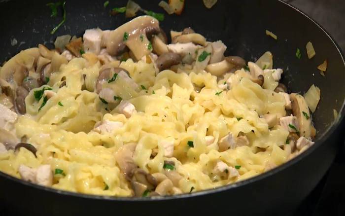 Через сито влить в сковороду воду, в которой замачивались грибы, добавить фестонате, индейку, петрушку, влить сливки и 50 мл воды, в которой варилась паста, все перемешать и прогревать еще пару минут.