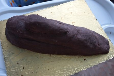 Для того, чтобы сделать лодку, я вырезала приблизительную форму из бумаги (довольно большая лодка получилась). Разрезаем бисквит на 3 части и далее по шаблону вырезаем форму.
