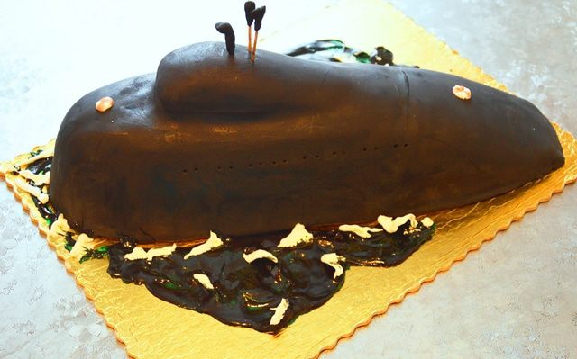 Далее остаются уже детали. Море я делала из леденцов, растопила их и сформировала волны, пену нарисовала айсингом. Вот такой мой первый фигурный торт.