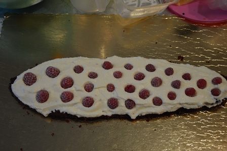 Вырезанные коржи промазываем кремом, можно добавить фрукты или орехи, у меня малина.