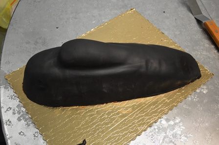 После того, как ганаш застынет, можно покрывать торт мастикой. У меня покупная, не знала, как черную сделать.