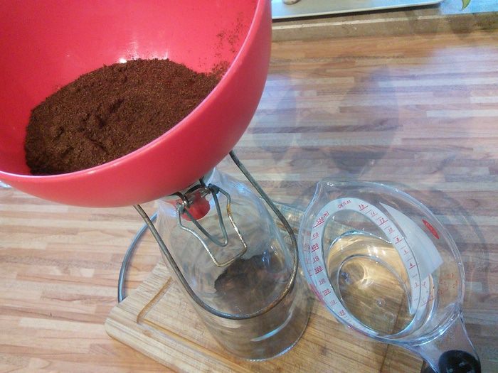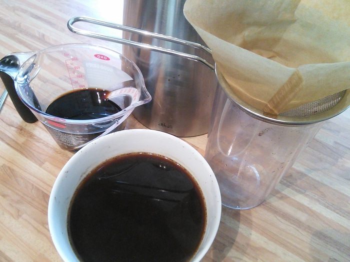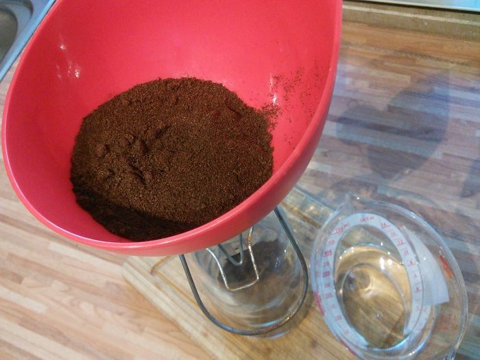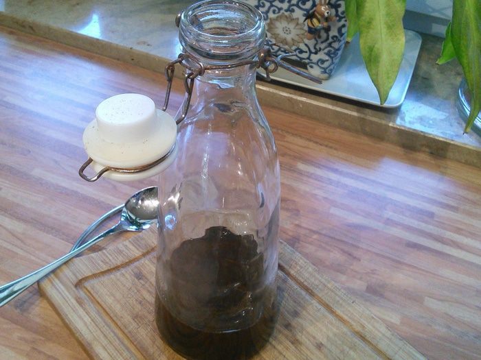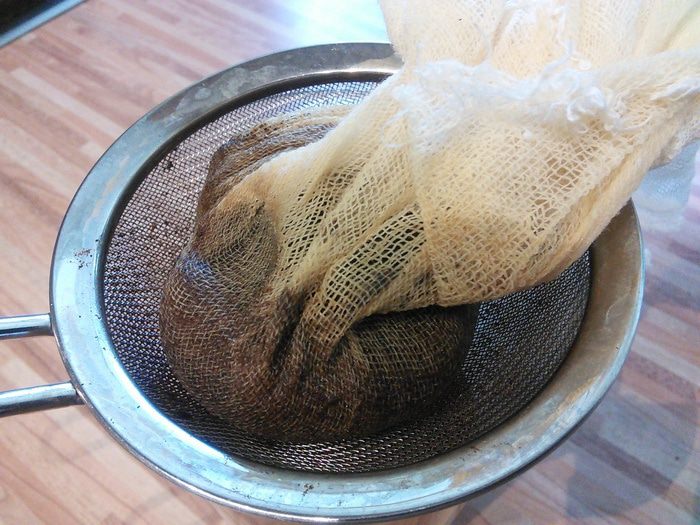 По истечении двух недель нужно процедить экстракт через фильтр от кофеварки, который предварительно смочить водой. Смачивать фильтр водой нужно для того, чтобы он меньше пропитался нашим драгоценным экстрактом. В конце легко выжать жидкость руками, не повредив при этом фильтр. Выход настоя у меня получился 200 мл.