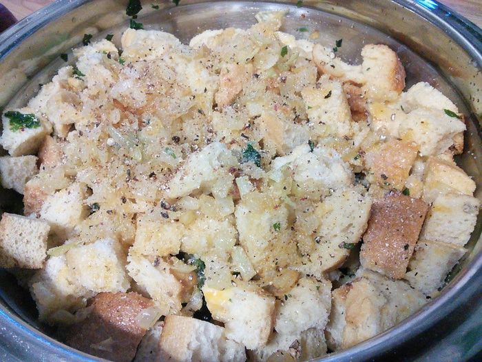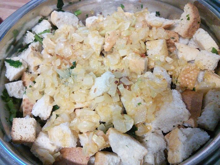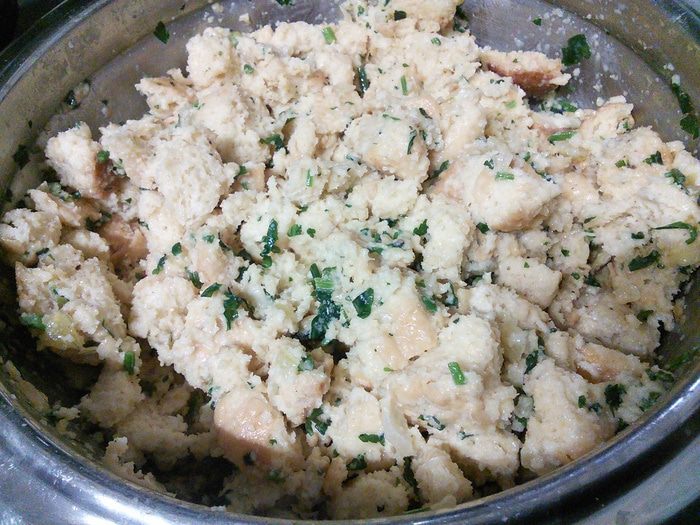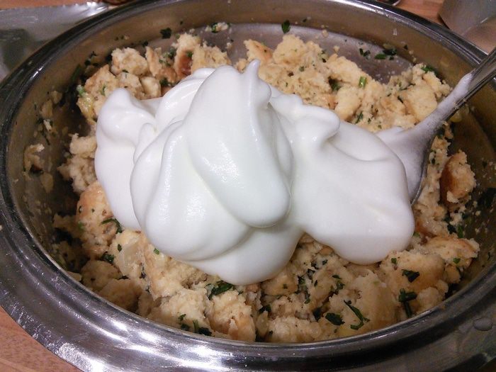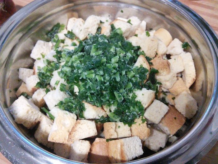 Немного подогреть молоко, отделить желтки от белков и разболтать желтки в молоке. Залить молоком хлеб, размешать, накрыть крышкой и оставить настаиваться и пропитаться на несколько часов. Время от времени перемешивать, по необходимости добавить чуток молока, но смесь не должна быть жидкой.