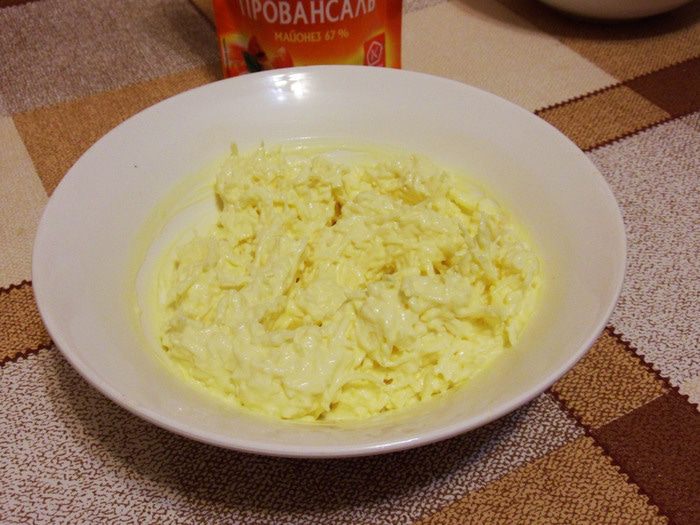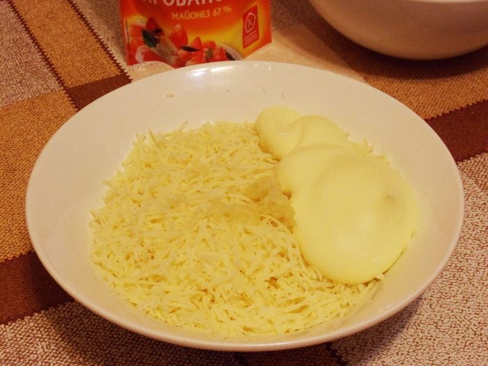 Второй слой должен быть острым. Для него нужен тертый твердый сыр и пропущенный через пресс чеснок. Добавить майонез.