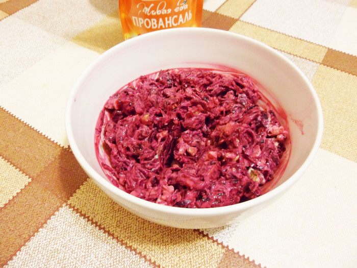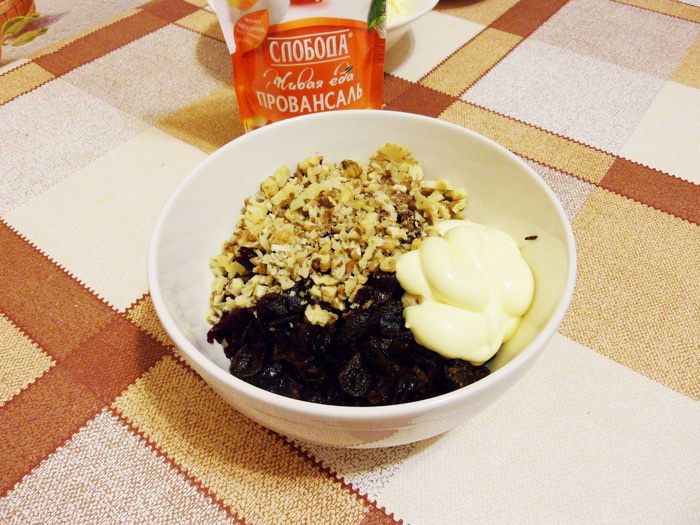 Третий слой — самый пикантный и нарядный. Вареную свеклу натираем на крупной терке, добавляем к ней грецкие орехи и нарезанный чернослив, майонез.