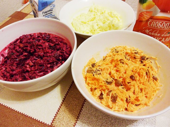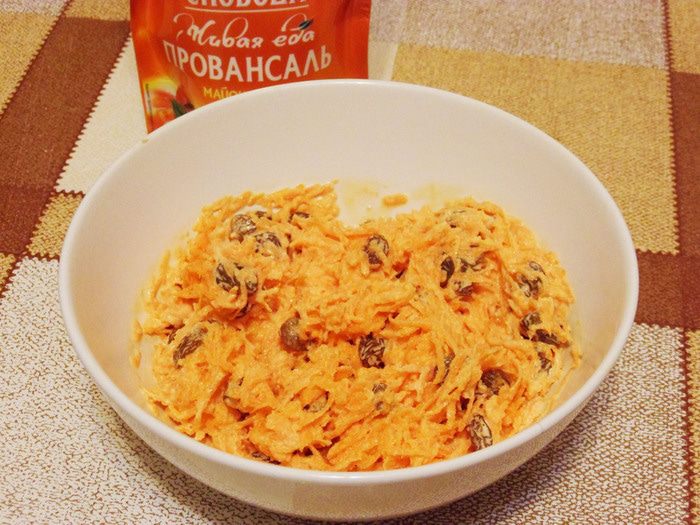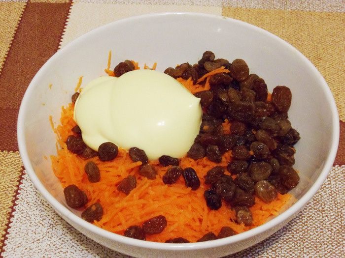 Для первого слоя нам понадобится сырая тертая морковь (лучше потереть ее на мелкой терке), изюм и майонез. Если морковь несладкая, можно добавить в нее немного сахара.