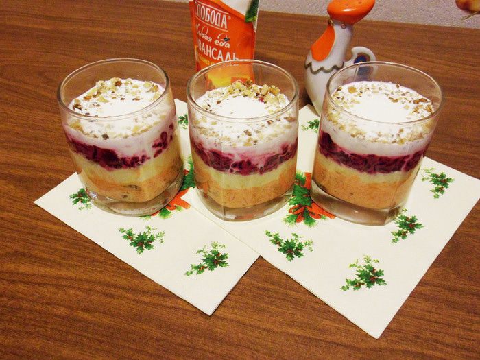 Теперь начинаем собирать салат, аккуратно выкладывая слои в стаканы.