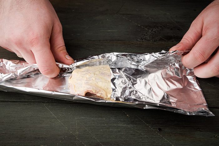 Завернуть в фольгу. Запекать в духовке 50 минут. Затем открыть фольгу и запекать еще 20 минут до золотистой корочки.