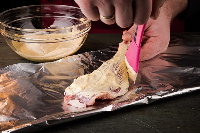 Готовой пряной смесью смазать каждый утиный окорочок.