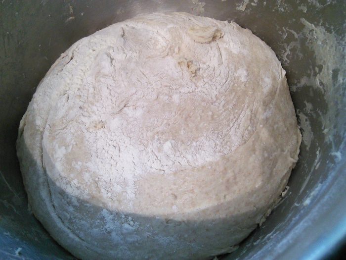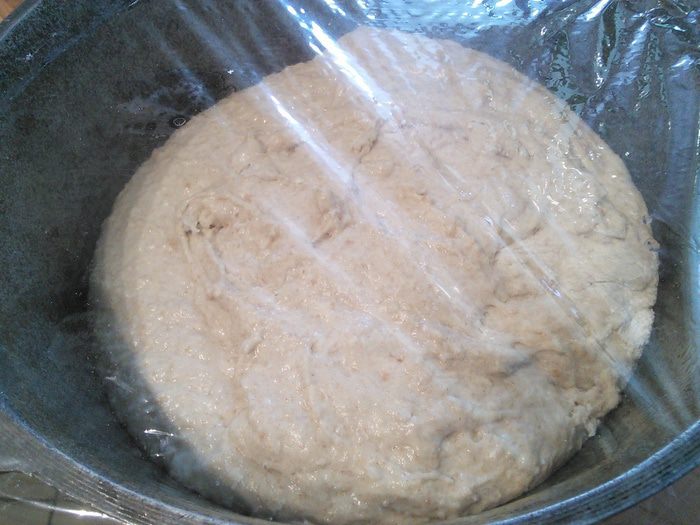*Тут я должна оговориться: мое тесто было липким и не смотря на добавление нескольких ложек ржаной и пшеничной муки оно так и не собралось в комок. Я решила не злоупотреблять и закончить замес на этом этапе.