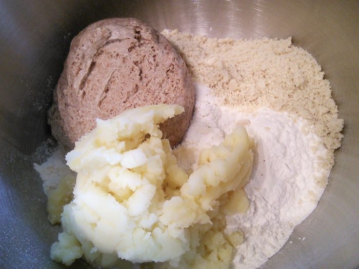 Сварить картошку в мундире. Отвар взвесить в граммах и охладить до 45°С. Развести дрожжи в картофельном отваре. Картошку очистить, размять. Смешать в чаше комбайна опару и остальные ингредиенты основного теста.