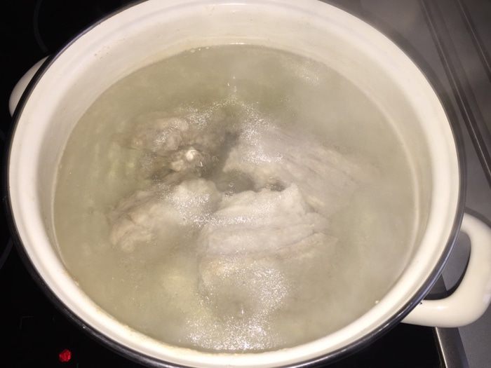 Итак: моем мясо, кладем в кастрюлю, заливаем водой и ставим на огонь. Снимаем всю пену, убавляем огонь и сразу закидываем горох.