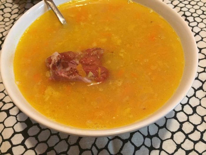 Горох можно замочить на ночь, но я часто забываю это делать, и современный колотый горох в целом в этом не нуждается. Можно просто замочить его, как только вы собрались варить суп, еще до разделки мяса и т.п. Пока дойдет до его закладки, он как раз чуть-чуть разбухнет.