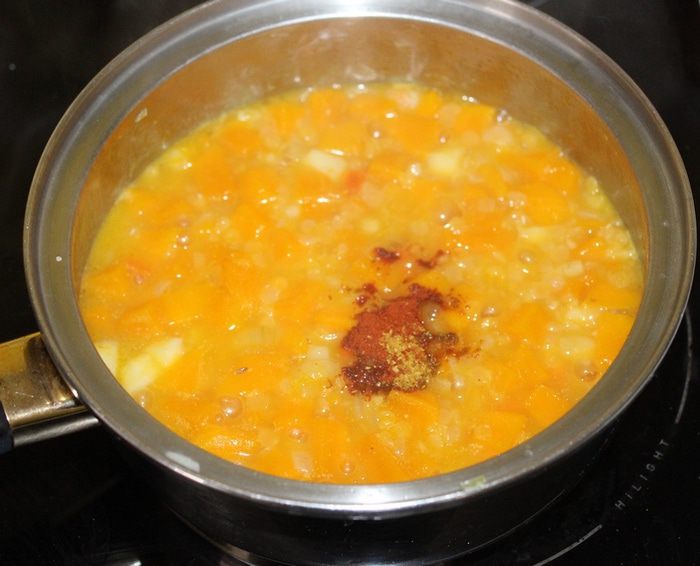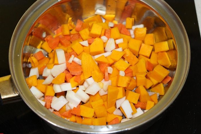 Добавляем нарезанные кубиками морковь, тыкву, корневой сельдерей, обжариваем 5 минут.