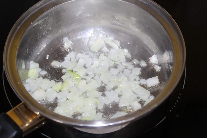 Спассеровать на растительном масле лук до прозрачности.