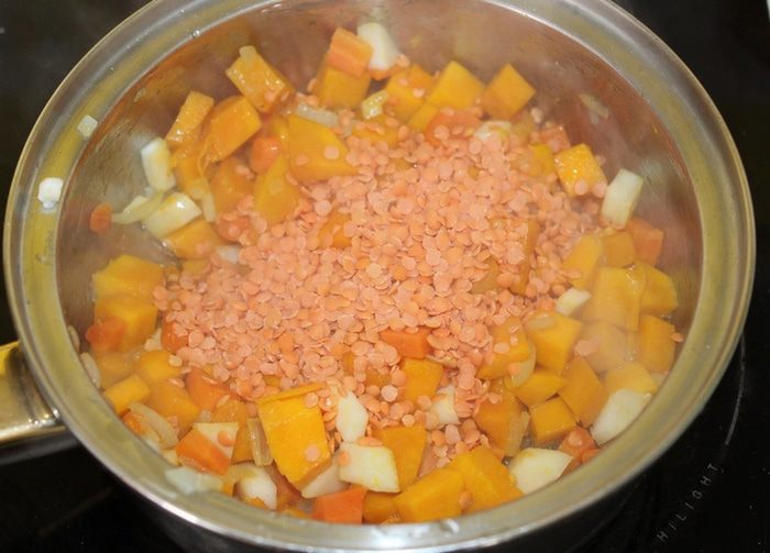 Добавляем чечевицу, заливаем бульоном и варим 20 — 25 минут до мягкости, накрыв кастрюлю крышкой.