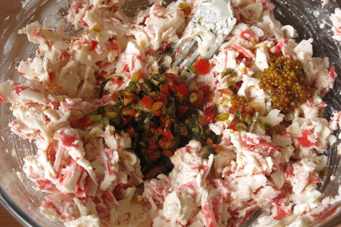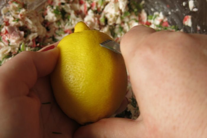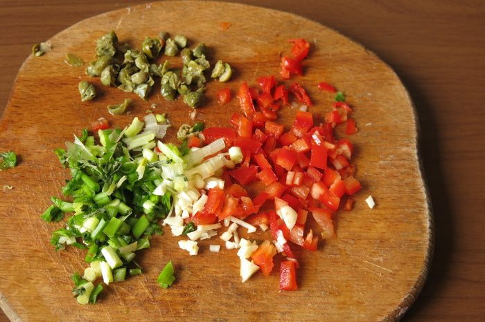 Нарезаем перо зеленого лука, пару столовых ложек сладкого перца, чуть острого перца, каперсы, один зубчик чеснока. В фильме рецепт записывается, но пропорции не оговариваются, известно, что есть два компонента — цедра и каперсы, но неизвестно, куда их кладут, в соус или фарш, поэкспериментировала, каперсы пойдут в фарш, а цедра и в соус, и в фарш.