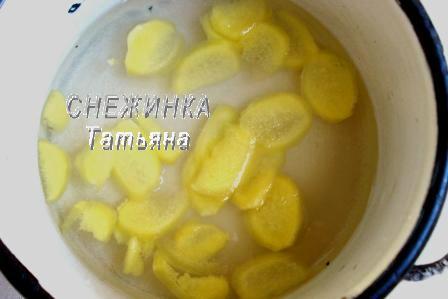 Имбирь чистим, нарезаем очень тонкими ломтиками. В кастрюльку наливаем воду, кладем сахар, кладем кусочки имбиря. Помешивая до растворения сахара, кипятим 15 минут.