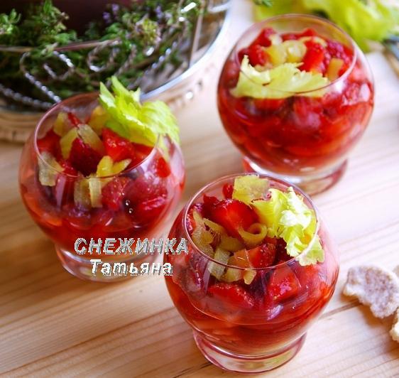 Этот десерт (таковым его обозвала я) из серии тех, которые надо смаковать, по чуть-чуть, ощущая небольшое обжигающее воздействие имбиря, хруст и солоноватость сельдерея, аромат, сладость и нежность клубники! Описать эмоции сложно, надо пробовать!