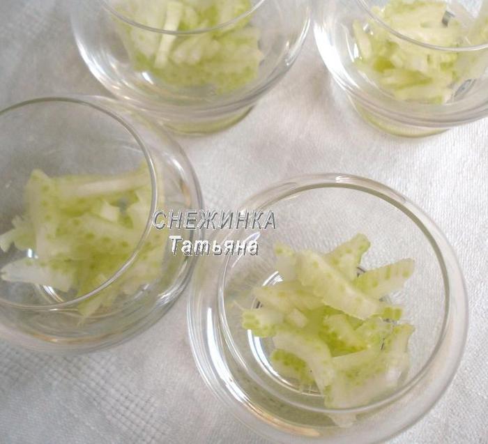 Сельдерей очищаем от жестких волокон. Нарезаем тонкими пластиночками. Раскладываем первым слоем в бокалы, стаканы, пиалы…