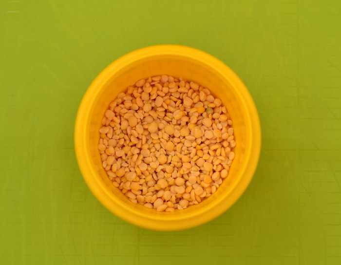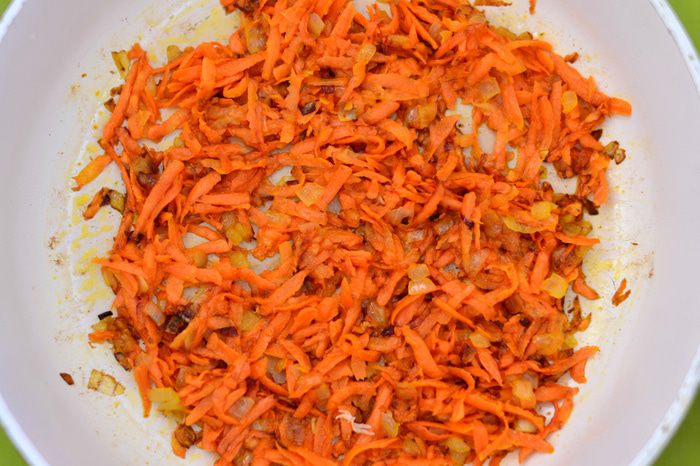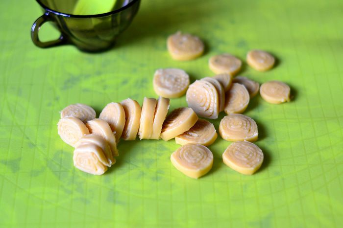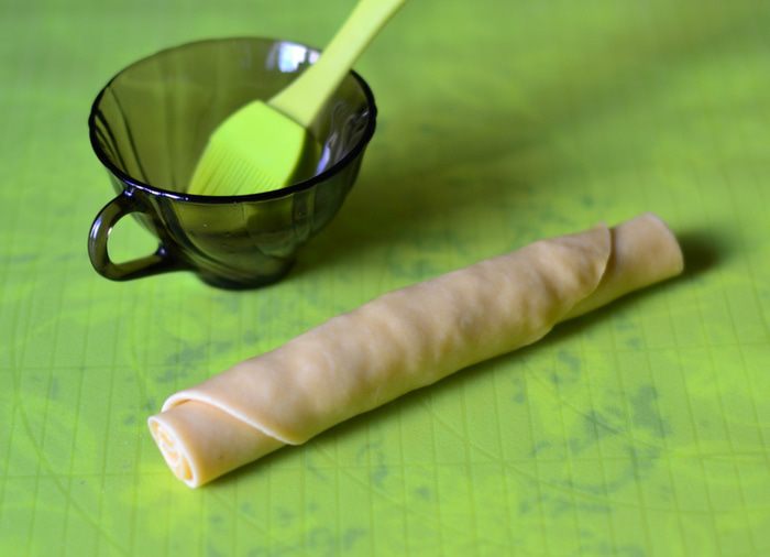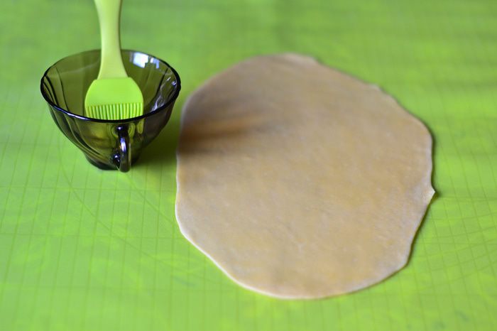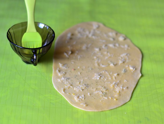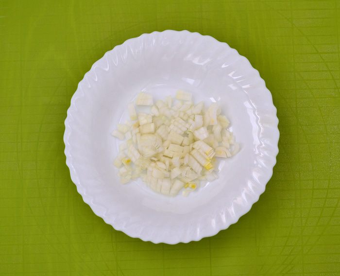 Пока варится горох, сделать тесто для чесночных рулетов. Из просеянной муки, кипяченой охлажденной воды (100 мл) и соли и 3 ст. л. растительного масла замесить тесто. Скатать в шар, накрыть пленкой. Лук мелко порезать, обжарить на растительном масле до золотистого цвета.
