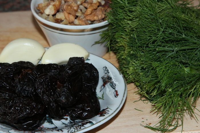 Чернослив моем, орехи крупно рубим, чистим два зубчика чеснока и подготавливаем укроп.